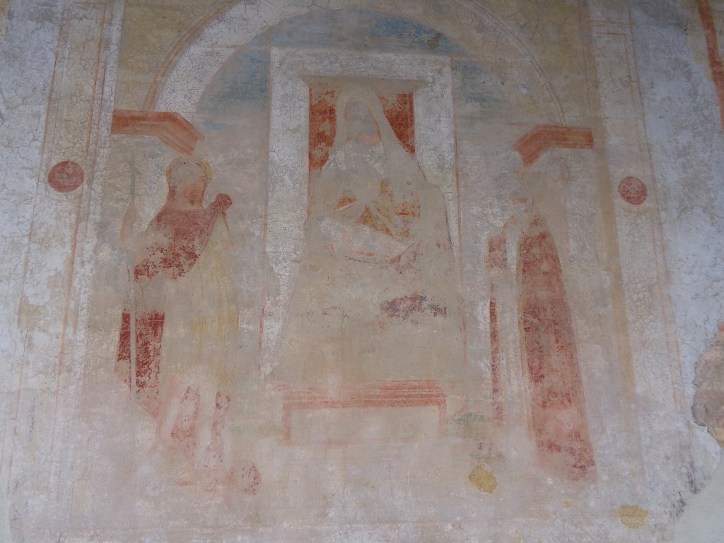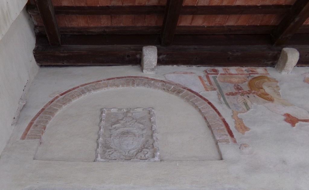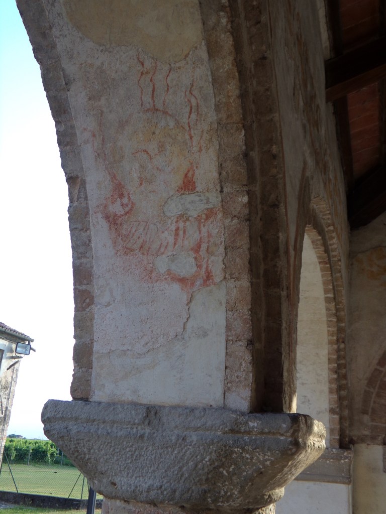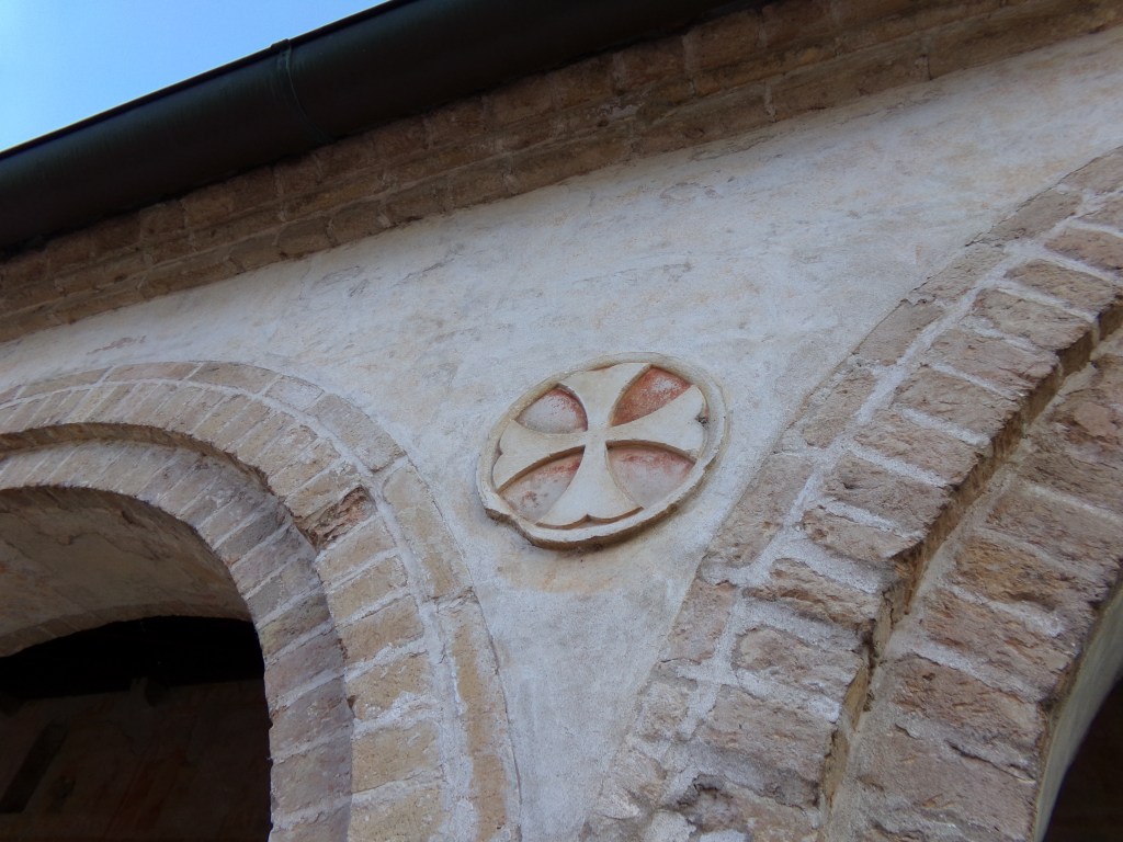 SUL FIANCO DESTRO DELLA CHIESA. SOTTO CLI ARCHETTI SONO VISIBILI TRATTI DI CROCI ROSSE RISALENTI AL PERIODO TEMPLARE, MENTRE SUL PORTICO SONO RAFFIGURATE LE CROCI “GIOVANNITE” SIMBOLO DEI CAVALIERI DI MALTA.