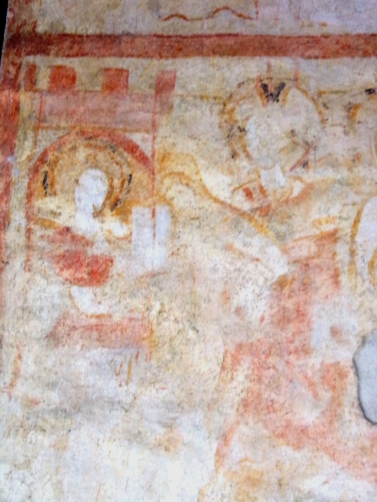 ALL’ INIZIO DEL SECONDO MILLENNIO, DOPO LA PUBBLICAZIONE DEL “CODICE DA VINCI” DI DAN BROWN E’ NATA UNA NUOVA LEGGENDA LEGATA AL MISTERO DEI TEMPLARI. UN AFFRESCO SITUATO SOTTO IL PORTICO ESTERNO, RAPPRESENTEREBBE LE FIGURE DI MARIA MADDALENA, GESU’ CRISTO ED UN BAMBINO IN FASCE CONSIDERATO LORO FIGLIO. SI TRATTA DELLA PERSONA CHE DIEDE ORIGINE AI MEROVINGI; SANGRAAL O SANGUE REALE DIEDE ORIGINE AL TERMINE “GRAAL”. MA NON ESISTONO RISCONTRI STORICI NE’ RELIGIOSI CHE SOSTENGANO QUESTA TESI, POTREBBE INVECE TRATTARSI DELLA “DORMITIO VIRGINIS” RAFFIGURANTE IL CORPO DI MARIA SUL LETTO DI MORTE CIRCONDATA DA ALCUNI APOSTOLI E DA MARIA MADDALENA.