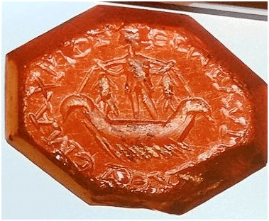 LA RAFFIGURAZIONE INTAGLIATA NELLA GEMMA OTTAGONALE RAPPRESENTA UN PESCATORE CHE INDOSSA UNA TUNICA PRIVA DI MANICHE, IN PIEDI, A BORDO DI UNA BARCA, CHE TIENE UN BASTONE SULE SPALLE CON DUE PESCI APPESI PER LA BOCCA. LA POPPA E LA PRUA DELL’IMBARCAZIONE SONO RAPPRESENTATE DA TESTE ZOOMORFE DI UCCELLO SIMILI UNA AD UNA COLOMBA E L’ALTRA AD UN’ ANATRA. ATTORNO ALL’ IMMAGINE UN’ ISCRIZIONE IN LETTERE GRECHE. POTREBBE TRATTARSI DI UN INTAGLIO FACENTE PARTE DI UN ANELLO. UN ANELLO MINUTO, FORSE, PERCHE’ SERVIVA AD UN MEMBRO DELLA COMUNITA’ CRISTIANA COME “PAROLA D’ ORDINE” PER ESSERE RICONOSCIUTO AI TEMPI DELLA PERSECUZIONE SOTTO L’ IMPERO DI DIOCLEZIANO (VEDI ARTICOLO L’IMMORTALITA’ DEI MARTIRI CONCORDIESI“); OGGETTO CHE POTEVA ESSERE NASCOSTO CON MAGGIOR FACILITA’ AI PERSECUTORI. LA CORNIOLA E’ ANCHE DI NOTEVOLE FATTURA, UN SIGILLO CHE POTEVA APPARTENERE AD UN PERSONAGGIO ECCLESIASTICO MOLTO IMPORTANTE. E’ IL PRIMO OGGETTO DI QUESTO GENERE RITROVATO AD ALTINO CON L’IMMAGINE CIRCOSCRITTA DA LETTERE GRECHE. CIO’ PORTEREBBE PORTARE A DEDURRE CHE POTREBBE ESSERE STATO IMPORTATO DALL’ ORIENTE. LA SUA ORIGINE E’ ANCORA INCERTA, MA LA SIMBOLOGIA DEGLI ELEMENTI INCISI SONO DI CHIARA MATRICE CRISTIANA.