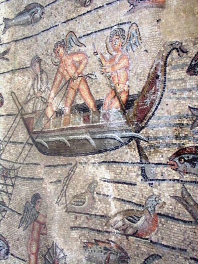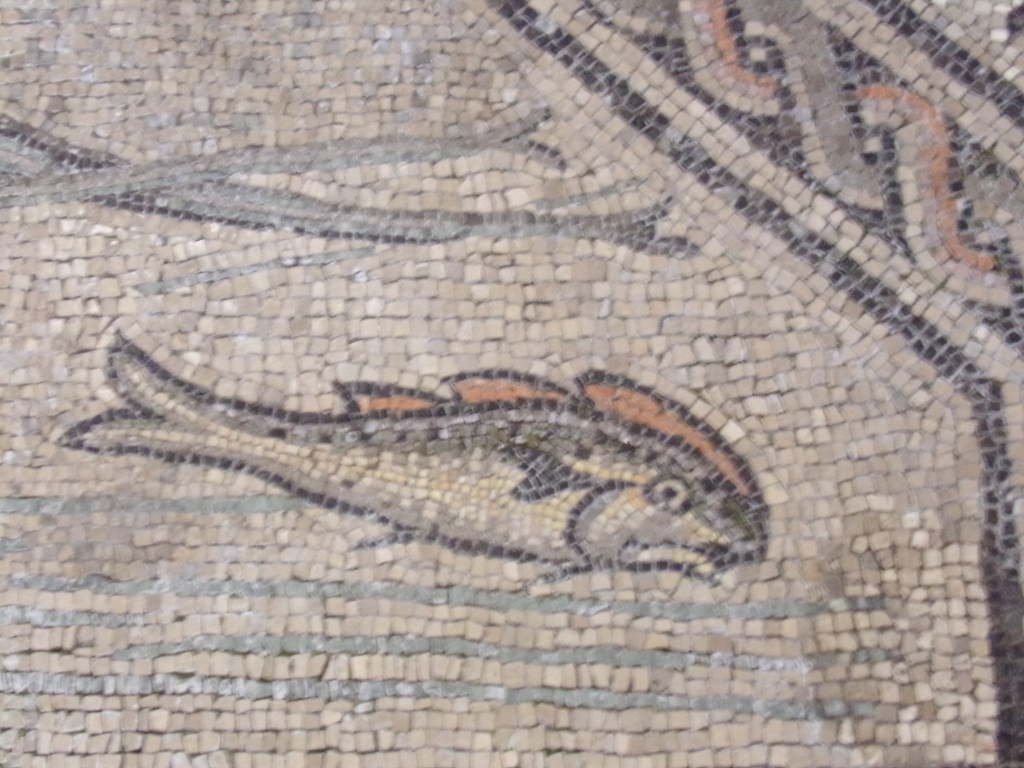 NELLA FIGURA SONO RAPPRESENTATI TUTTI I SIMBOLI DESCRITTI DA CLEMENTE ALESSANDRINO NEL PEDAGOGO: COLOMBA (POPPA O PRUA?), NAVE, VENTO, PESCATORE, PESCI ED INFINE LA LIRA. SECONDO IL PROFESSOR MASTROCINQUE, LA TRADUZONE POTREBBE ESSERE LA SEGUENTE: “CRISTO SALVATORE. IL GRANDE PESCE DELLA LIRA”.