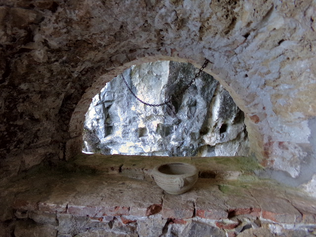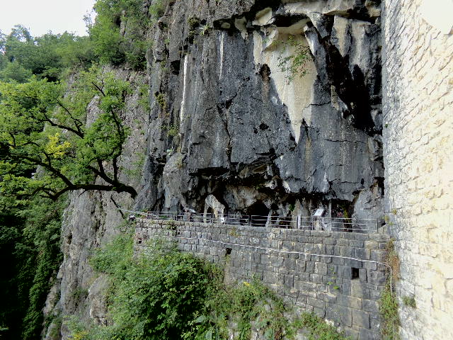 Terminata la salita si giunge alla caverna di ingresso che contiene una chiesa consacrata, ristrutturata, probabilmente abitata, in epoca romana, da un sacerdote di Mitra. All’entrata, il manto della grotta protegge l’altare centrale, una composizione lignea in stile barocco opera di Bartolomeo Ortari di Caporetto, con le statue di Santo Stefano Protomartire, San Giovanni Battista e San Giovanni Evangelista, l’incoronazione della Vergine e l’annunciazione.