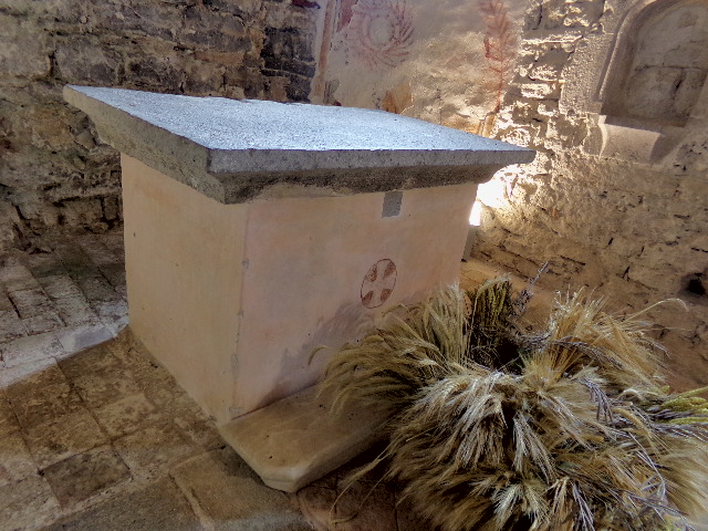 La parete dell’abside, un tempo doveva essere totalmente coperta da affreschi di cui sono rimasti solo alcuni frammenti, sono visibili le croci greche, diverse immagini del sole cigliato, e foglie di palma. Il sole cigliato è un simbolo che rappresenta una connessione tra la luna ed fuoco solare. Il sole rappresenta la stella del giorno, le foglie di palma il ciclo lunare, simbologia che risalta la connessione tra gli opposti. La palma, è il primo vegetale in grado di nascere su un terreno bruciato, paragonabile alle fenice che risorge dalle ceneri a simboleggiare la rinascita dopo la morte, quindi la resurrezione. Quando Gesù entrò a Gerusalemme a cavallo di un somaro, i fedeli lo accolsero sventolando rami di palma simbolo di regalità e di pace. La palma e l’olivo sono simboli del Cristo che ha vinto la morte, il trionfo della vita eterna sul peccato: “il giusto fiorirà come una palma, crescerà come il cedro del libano”.