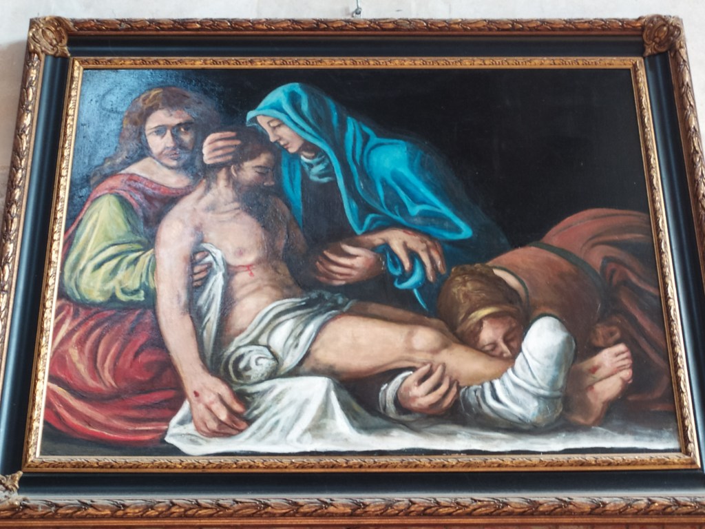 Giuseppe chiese il corpo di Gesù e, aiutato da Nicodemo, lo depose dalla croce, lo liberò dai chiodi conficcati nei piedi e nelle mani. Trasportarono il Cristo al sepolcro e lo affidarono alle donne per l’unzione. Le donne, secondo il rituale ebraico, cosparsero il corpo di mirra e aloe, lo avvolsero con un tessuto sinotico chiamato “sindon” poi legato con teli.