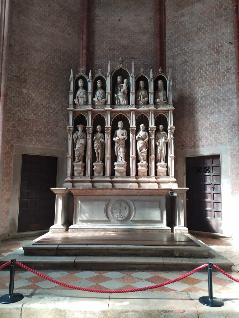 Nel corso dei secoli la Basilica di “Santa Maria Gloriosa dei Frari” è divenuta un vero e proprio museo di opere d’arte appartenenti al periodo che va dal XIII al XX secolo tra cui due dipinti del Tiziano. Contiene le tombe dello stesso Tiziano e del Canova. L’attuale chiesa in pietra d’Istria, ha una geometria a forma di croce latina, la facciata in stile gotico.