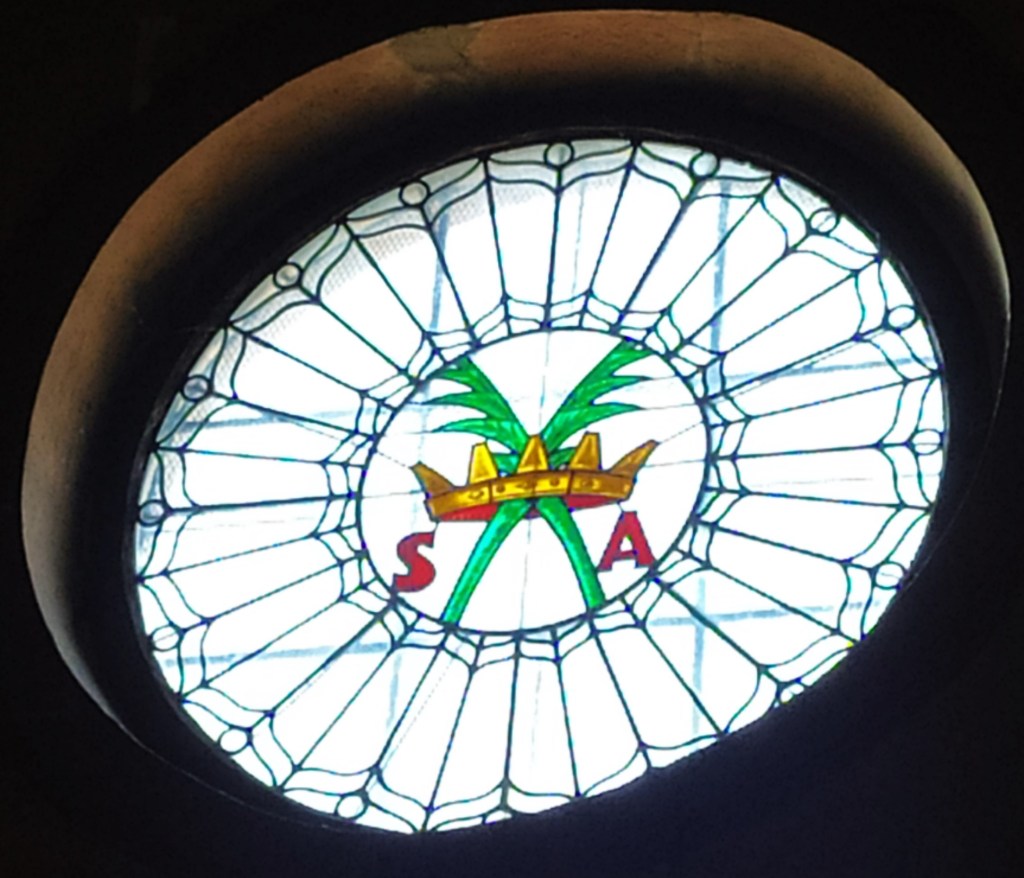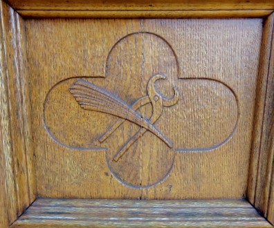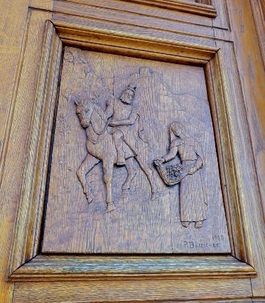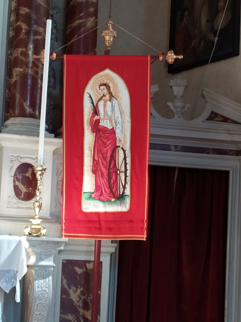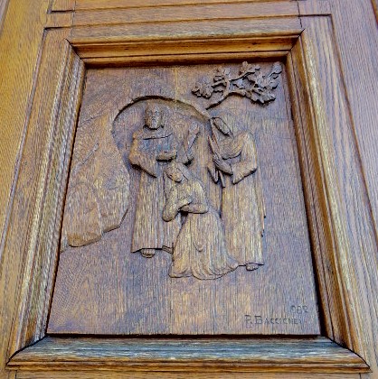Nel portone principale, e nelle opere all’interno del tempio troviamo ripetutamente rappresentati simboli ed immagini che hanno come riferimento la storia della Santa di Serravalle.