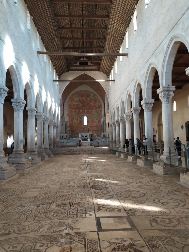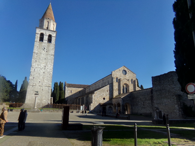 All’estremità del viale costeggiato da cipressi appare la maestosa basilica di Santa Maria Assunta; risale all’anno 313 d.C. ciò significa che i lavori di costruzione iniziarono subito dopo l’emanazione dell’editto di Milano noto come editto di Costantino. La basilica rappresenta il monumento rappresentativo della città, testimonianza di un’attività religiosa cristiana molto attiva. Dopo la distruzione della città nell’anno 452, gli abitanti di Aquileia la ricostruirono ben quattro volte sovrapponendo le nuove costruzioni ai resti delle precedenti. L’attuale basilica risale alla metà del IX secolo con successive modifiche degli archi e del tetto che risalgono al XIV e XV secolo.