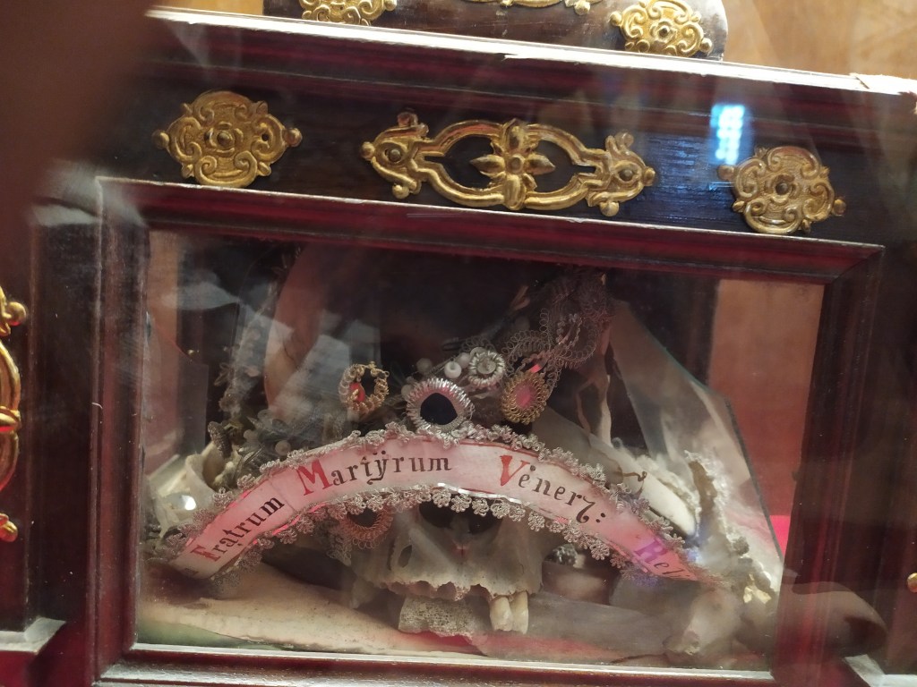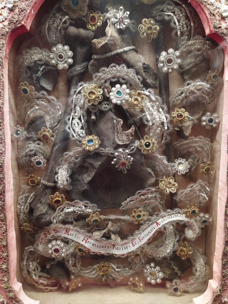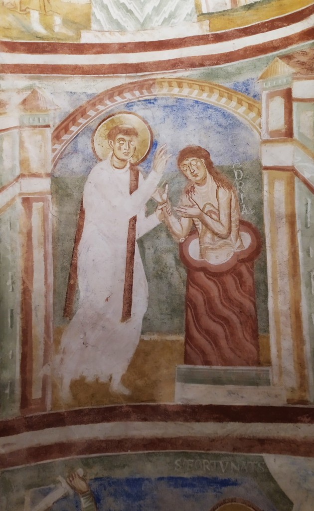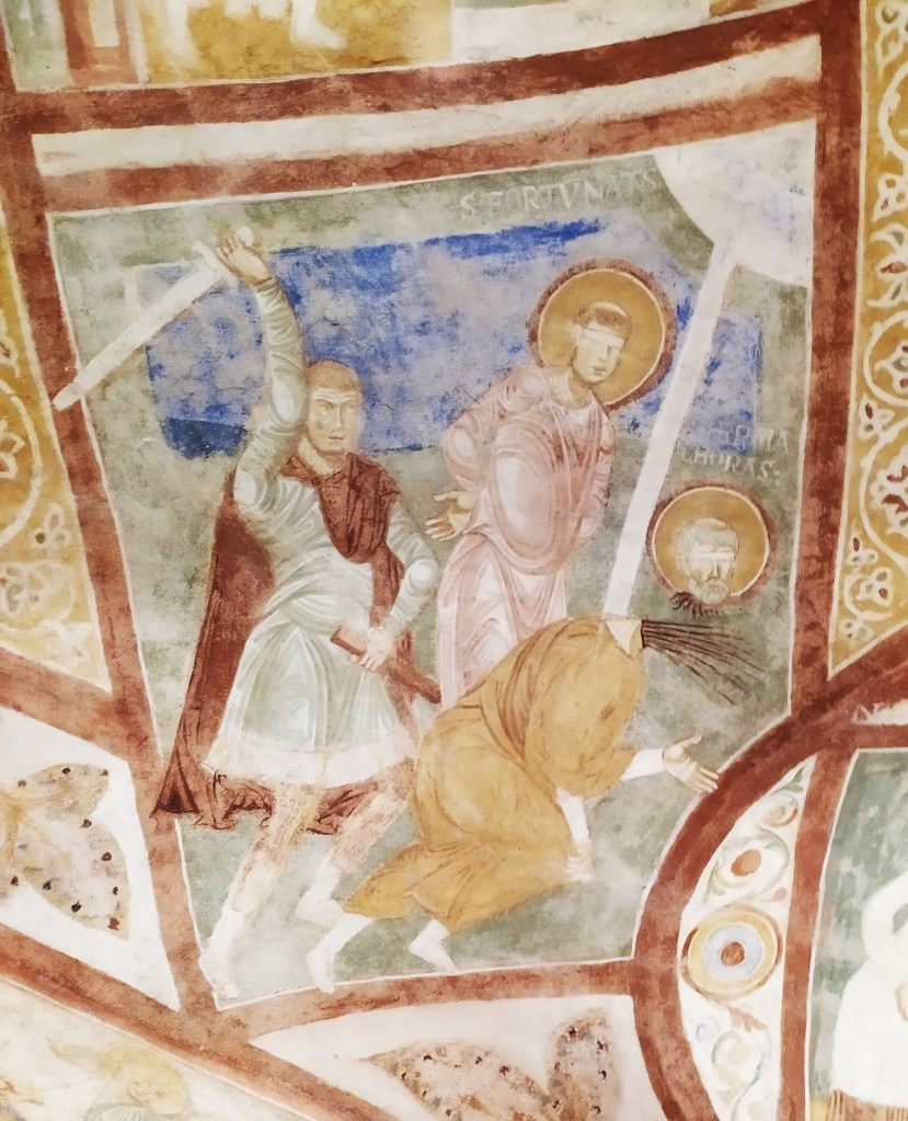 Un affresco presente nella cripta rappresenta la decapitazione del vescovo Ermagora mentre sullo sfondo appare la figura del suo diacono “Fortunato”, pure lui condannato alla decapitazione.