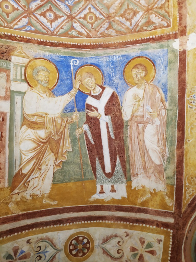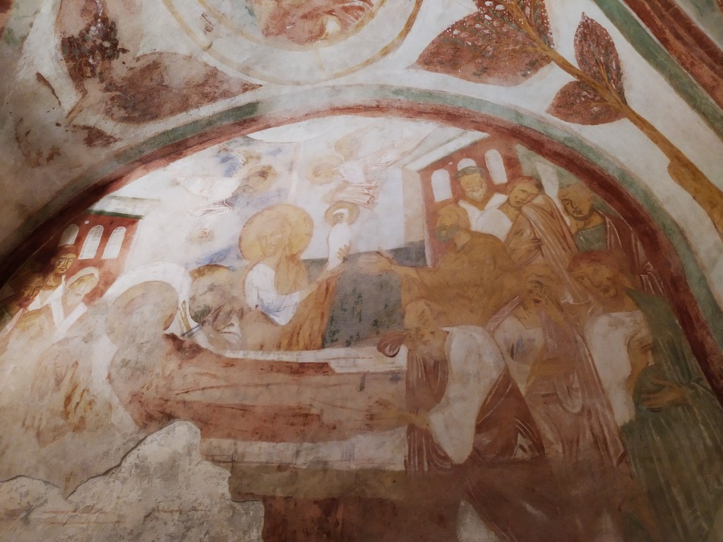 Importante è l’affresco che rappresenta il conferimento dell’incarico di evangelizzazione di Aquileia da parte di San Pietro a San Marco. In un’ altro affresco viene rappresentato San Pietro che conferisce l’investitura di vescovo ad “Ermagora”, su suggerimento dello stesso San Marco.