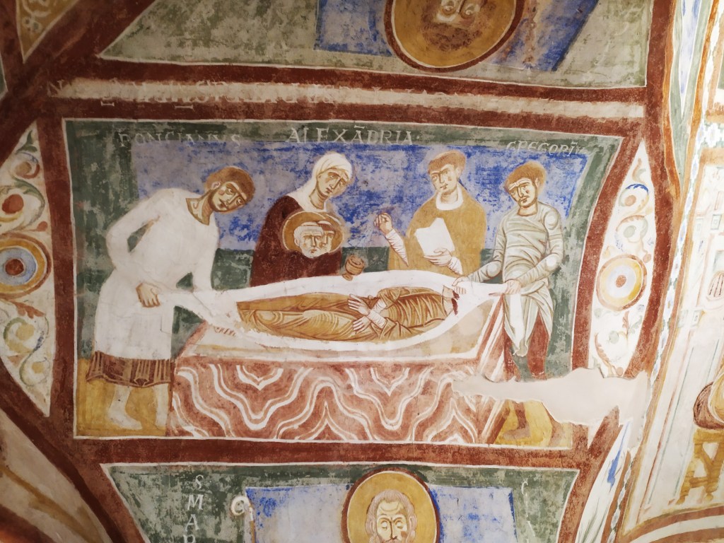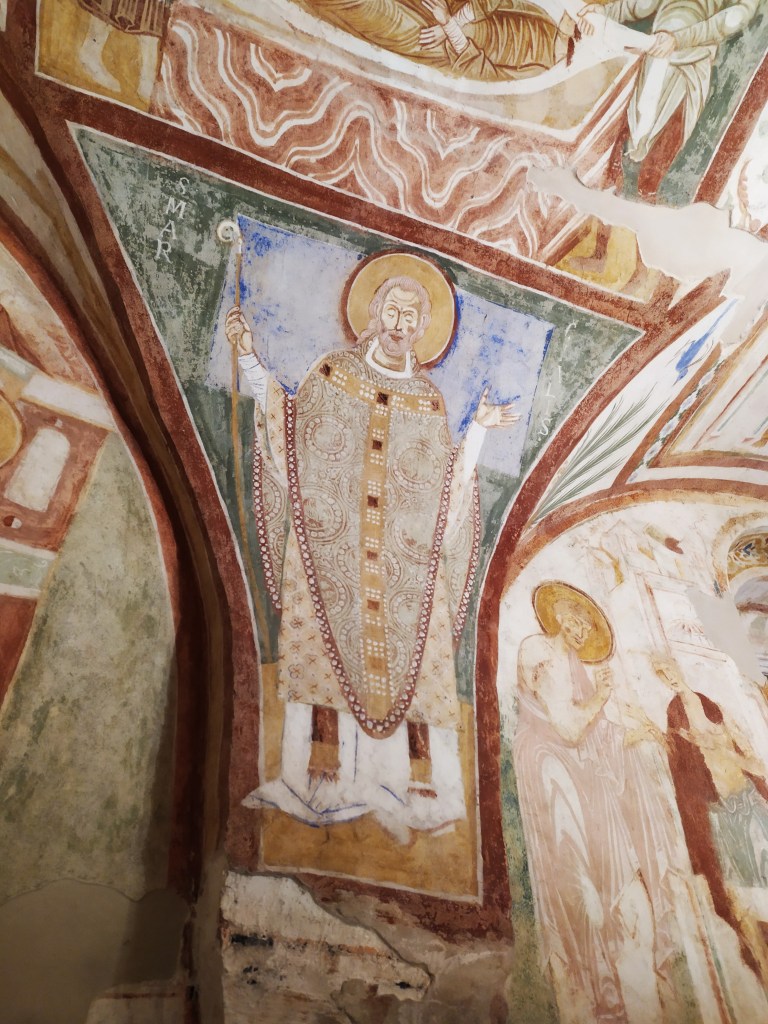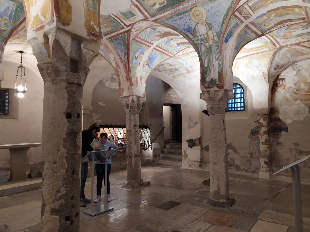 La cripta, come la vediamo oggi, venne fatta affrescare nel XII secolo dal Patriarca Ulrico Trefeen, al suo interno gli affreschi rappresentano i più antichi affreschi cristiani d’occidente.