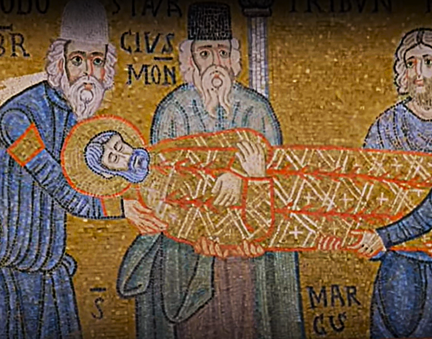 Negli anni a seguire continuò a predicare ad Alessandria d’Egitto dove venne nominato primo vescovo della città. Morì alcuni anni dopo, nel 68 d.C.; le sue reliquie vennero custodite nella Chiesa di Canodo. L’edificio venne più volte distrutto e alla fine del 644 venne incendiato dagli arabi. Nell’anno 848 due mercanti Veneziani, inviati dal doge Partecipazio, intrapresero una missione quasi impossibile, di mantenere la promessa fatta dal santo riportando le sue spoglie a Venezia. Bruno da Malamocco e Rustico da Torcello rubarono le spoglie del santo che, in quel momento si trovavano nella chiesa di Canodo ad Alessandria e le nascosero tra pezzi di carne di maiale, carne ritenuta impura dai mussulmani. Fu così che i doganieri rinunciarono ad ispezionare il carico permettendo ai due mercanti di imbarcarsi. La missione sembrava terminata, ma una grossa tempesta inghiottì il barcone spingendolo con le onde nei pressi di Cropani, una località della costa calabra. Grazie a Dio, i naufraghi vennero aiutati dagli abitanti del luogo e, come compenso, Buono e Rustico lasciarono alla città una reliquia del Santo, custodita ancora oggi nella Chiesa di Santa Lucia. I due mercanti rientrarono a Venezia accolti con tutti gli onori, consegnarono al doge le spoglie del Santo. Per custodirle, il doge Partecipazio fece costruire una piccola cappella. La promessa fu mantenuta. San Marco l’evangelista, autore di uno dei vangeli canonici, è venerato in tutte le chiese cristiane, ortodosse e copte.