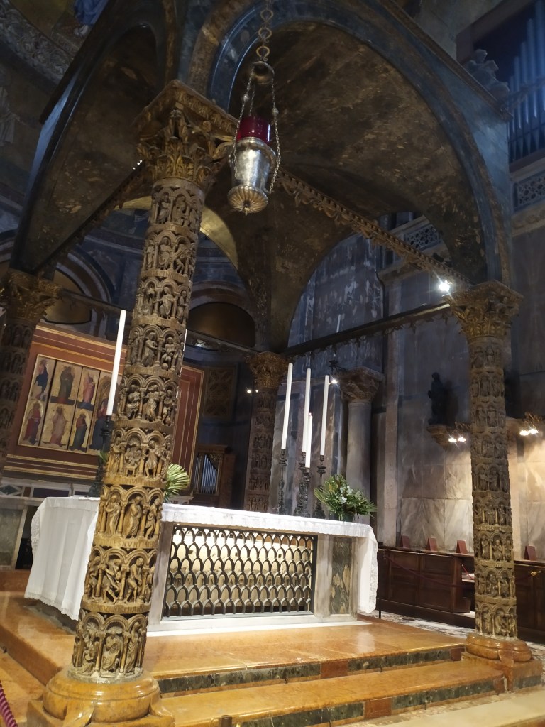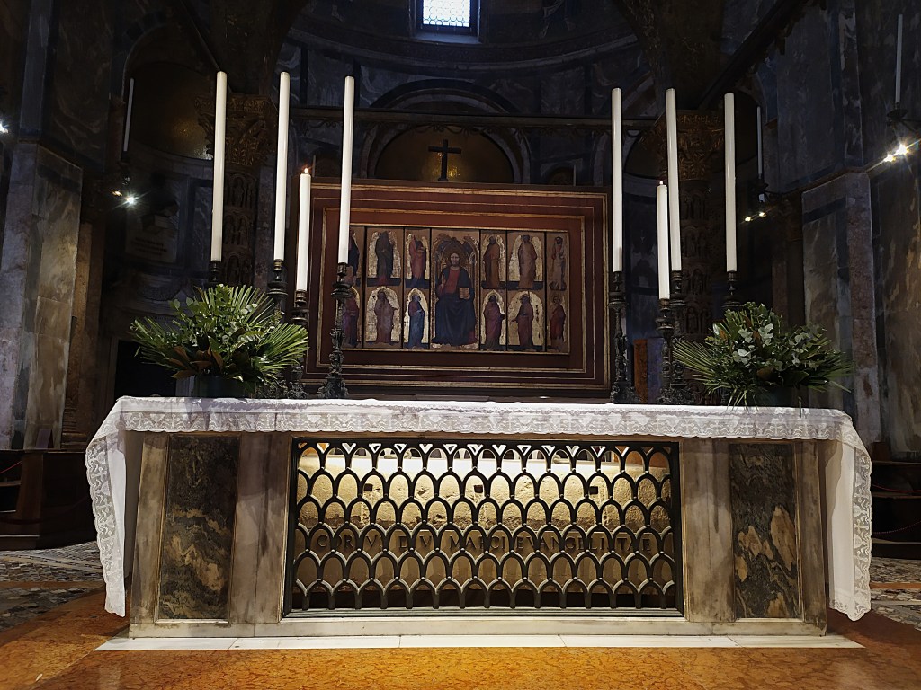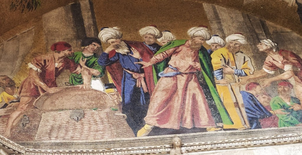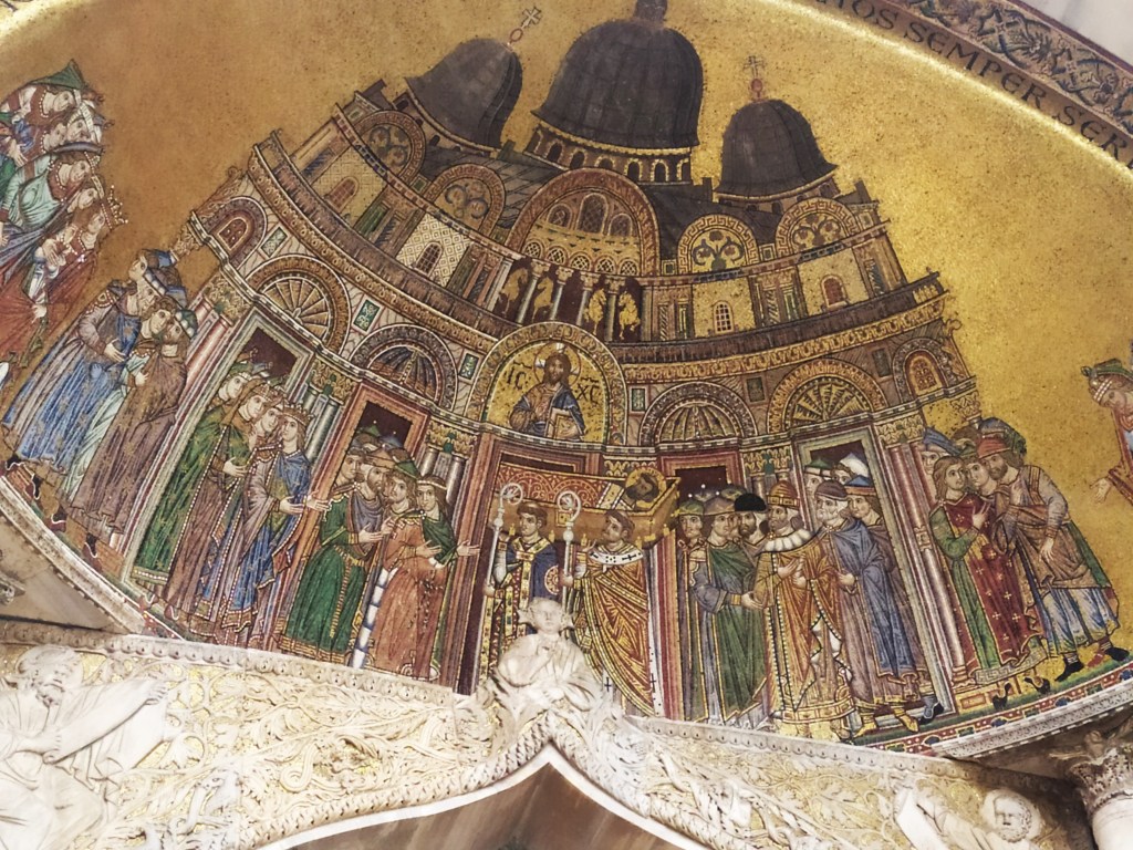 La presenza di San Marco a Venezia è alimentata da una serie di storie e leggende tramandate da generazione in generazione ed è raccontata artisticamente negli affreschi e in altre opera d’arte presenti nella basilica. All’interno del luogo sacro sono custodite, all’interno del sarcofago, le spoglie del santo evangelista patrono della città di Venezia.