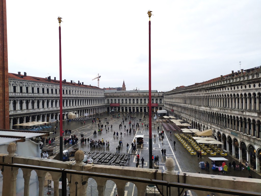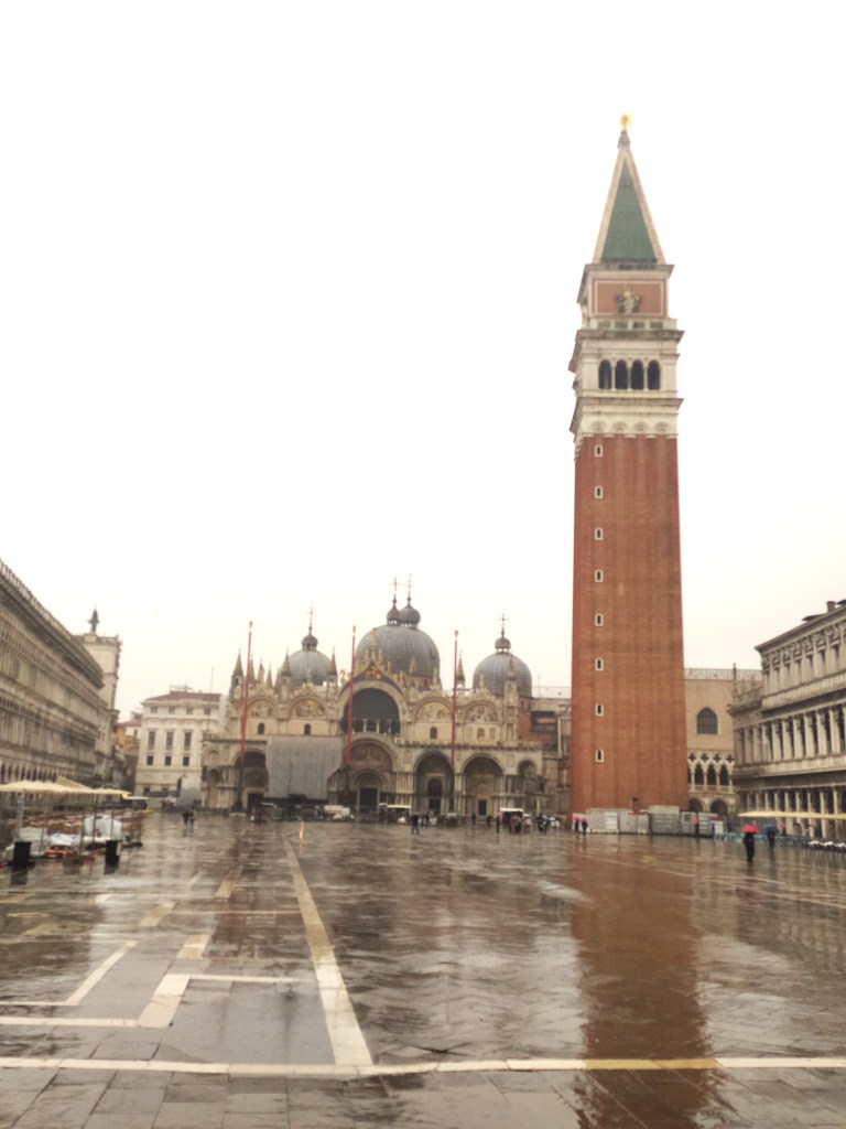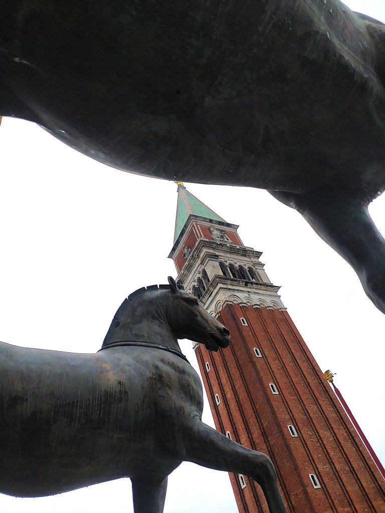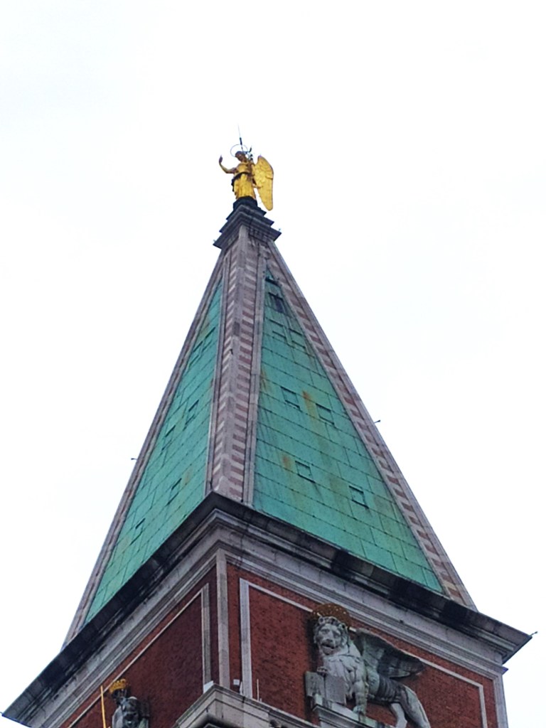 La basilica sorge all’estremità dell’immensa piazza veneziana, di fronte si innalza l’immenso campanile. Si tratta di uno dei più alti campanili d’Europa, con i suoi 98,6 metri d’altezza è chiamato dai veneziani con il termine “paron de casa” (padrone di casa). Inizialmente venne eretto come torre di avvistamento e di faro. Nel 1489 venne colpito da un fulmine e nel 1511 danneggiato da un terremoto. Il campanile crollò nel luglio 1902 a causa di una fenditura che si era aperta nel fianco dell’immenso colosso. Dieci anni dopo, nel 1912, in occasione della festa di San Marco, venne inaugurato il nuovo campanile completato con l’innesto di una cuspide dalla forma piramidale dotata di una piattaforma rotante con funzione di segnavento; all’estremità è fissata la statua dorata dell’arcangelo Gabriele che sorveglia e protegge la città.