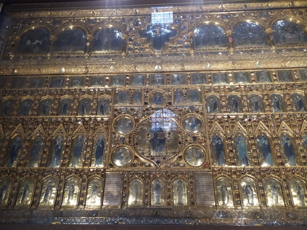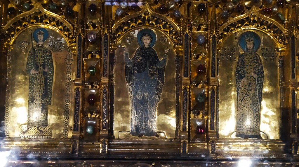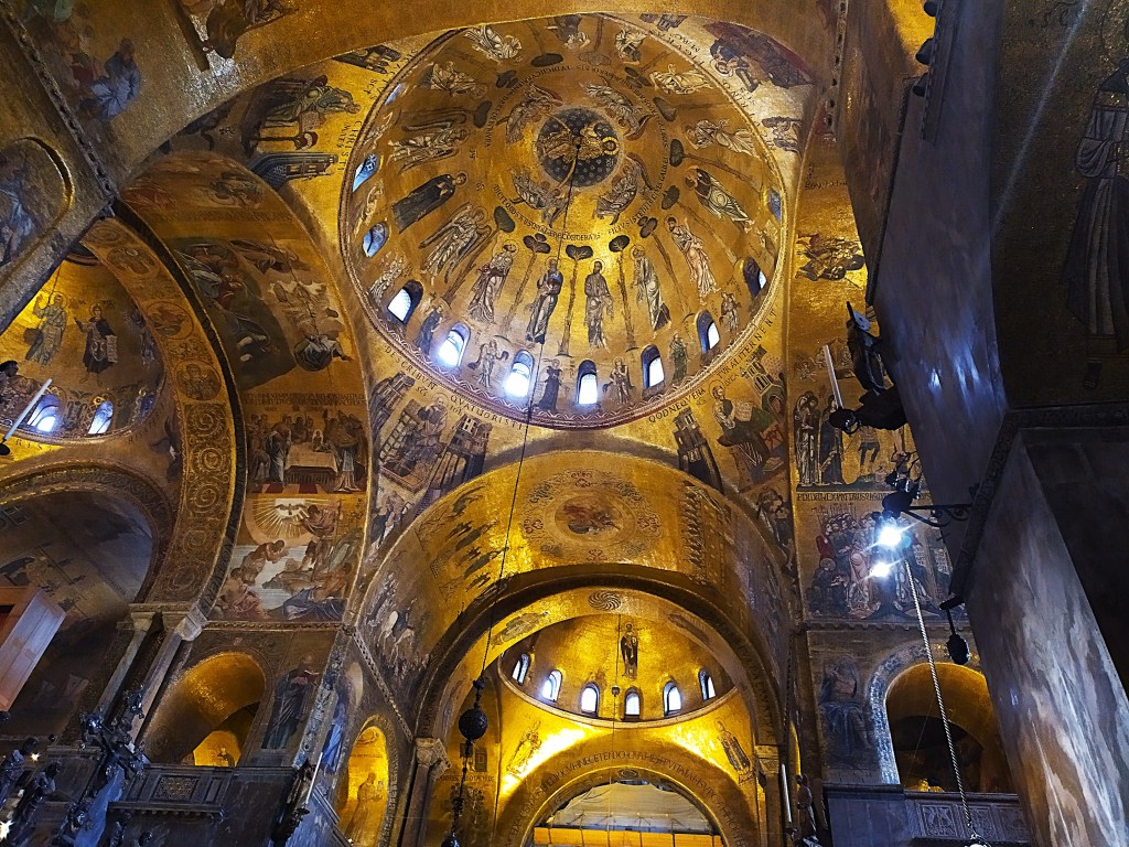 Il complesso basilicale sorge su una pianta a forma di croce greca volta verso un genere architettonico orientale con soffitti decorati da immensi mosaici dorati che, con il riflesso delle luci, esaltano una luminosità giallo oro, raffiguranti cicli di affreschi capaci di comunicare con semplici immagini avvenimenti che riportano la storia della basilica, episodi biblici ed altri che raccontano vita del santo patrono; un’arte comprensibile a tutti, facile da tradurre anche alla parte analfabeta del popolo. Il lungo lampadario bizantino, pendente nella sala della pala d’oro, un tempo costellato di candele, offriva ai fedeli un’ampia visione della sala e delle volte architettoniche decorate da simboli ed immagini biblici.