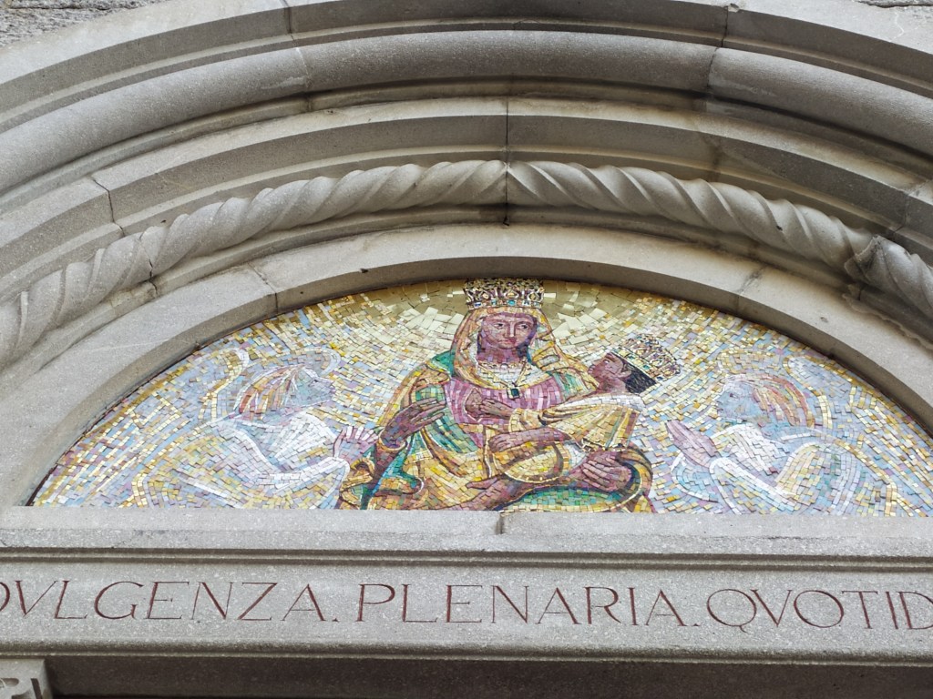 Al centro dell’altare centrale, protetta da una teca, la statua della madonna, avvolta da un manto dorato con una corona sul capo, sostiene il bambino Gesù, pure lui incoronato.