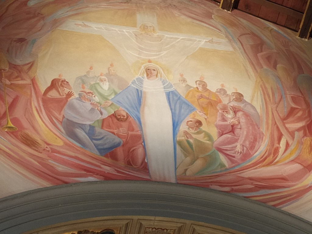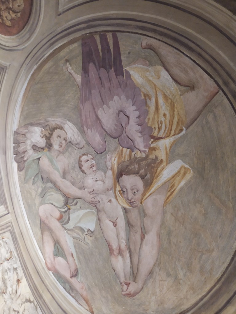 Alcuni affreschi presenti sul soffitto a volta raffigurano demoni che portano all’inferno anime dannate, mentre dalla parte opposta angeli che trasportano anime pure in paradiso. Un chiaro messaggio rivolto a tutta l’umanità, che la lotta tra il bene ed il male non è affatto conclusa, iniziata in tempi ancestrali è ancora in corso, e sempre in continua evoluzione.