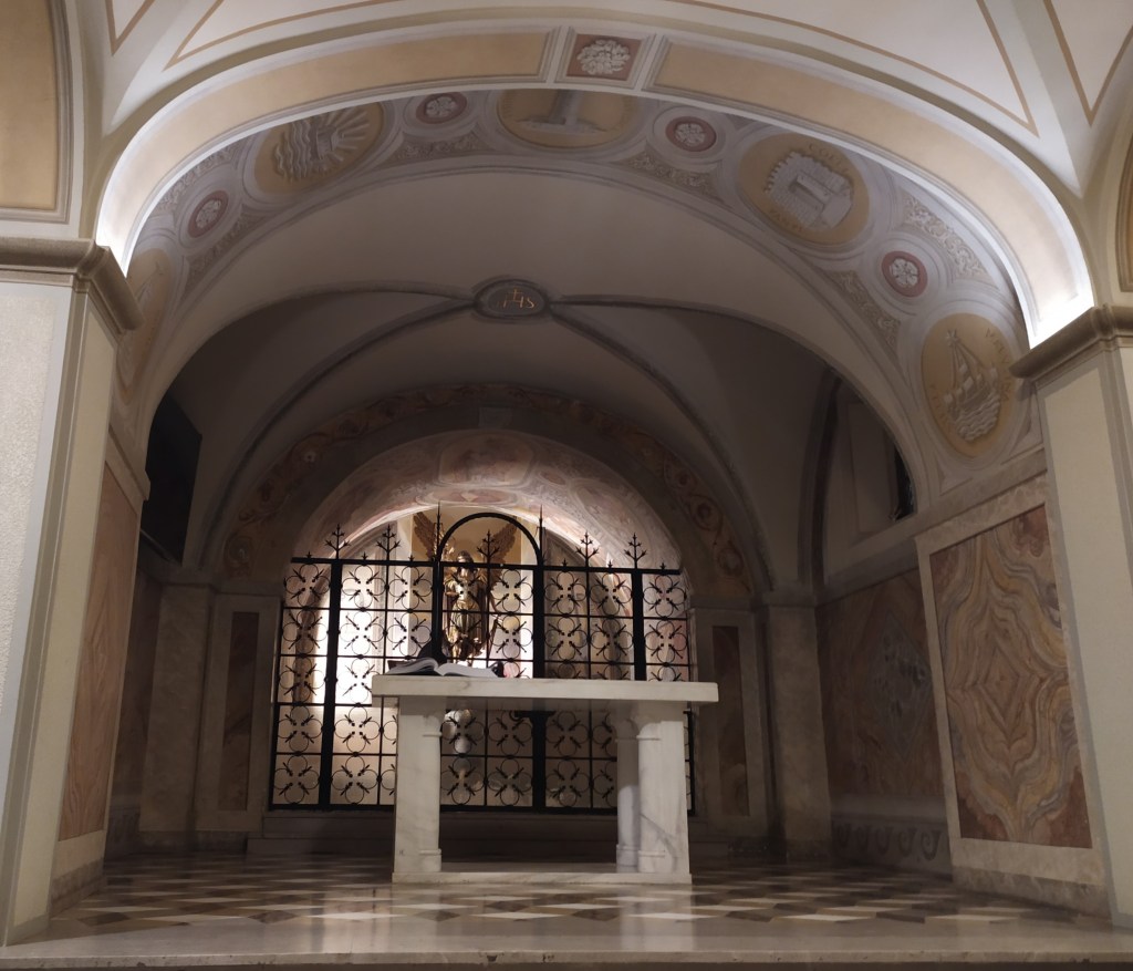 Dal corridoio dei confessionali una scala conduce alla cripta. Nelle pareti del piano sotterraneo sono esposti gli ex voto lasciati dai pellegrini che hanno ricevuto le grazie.